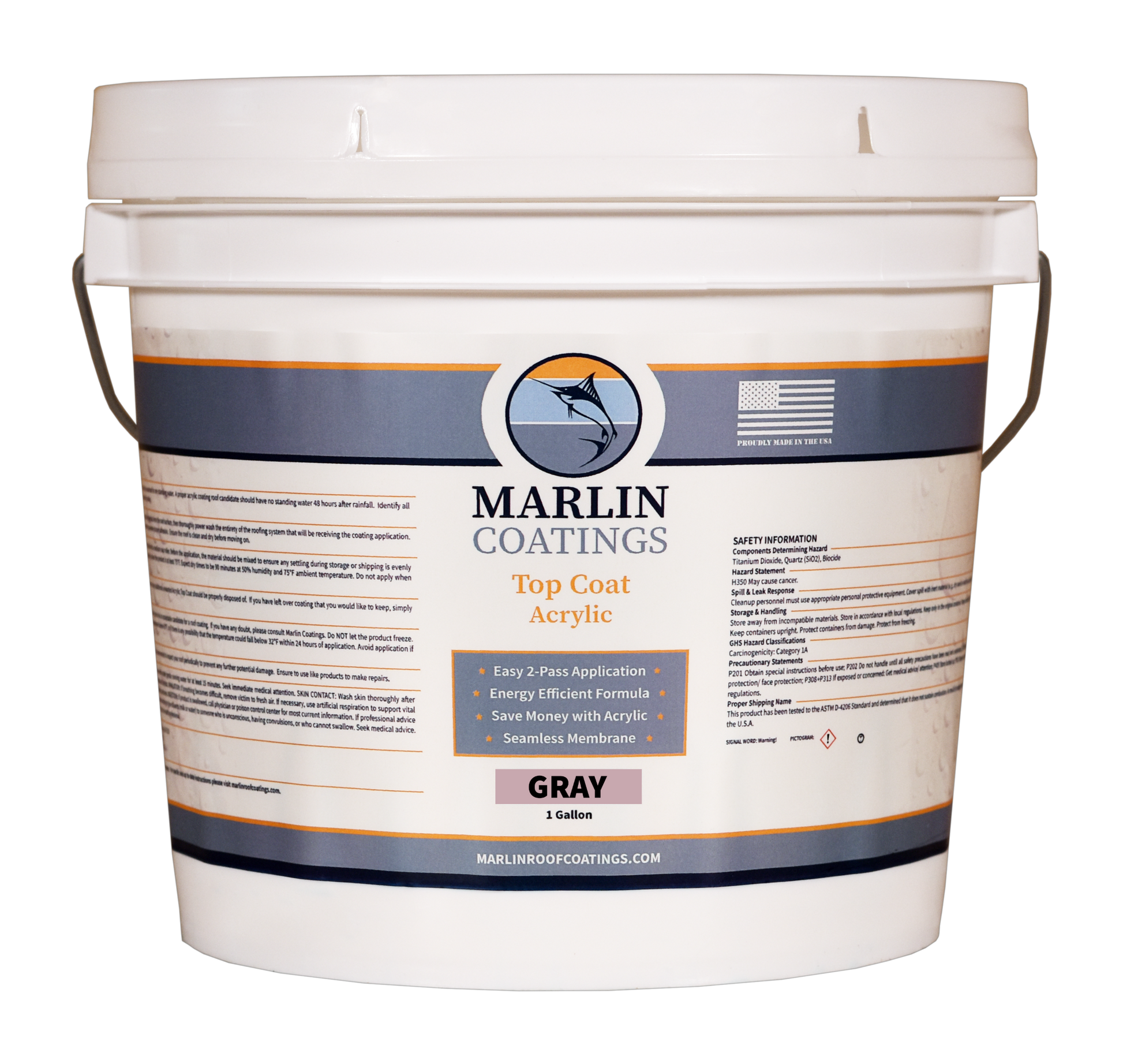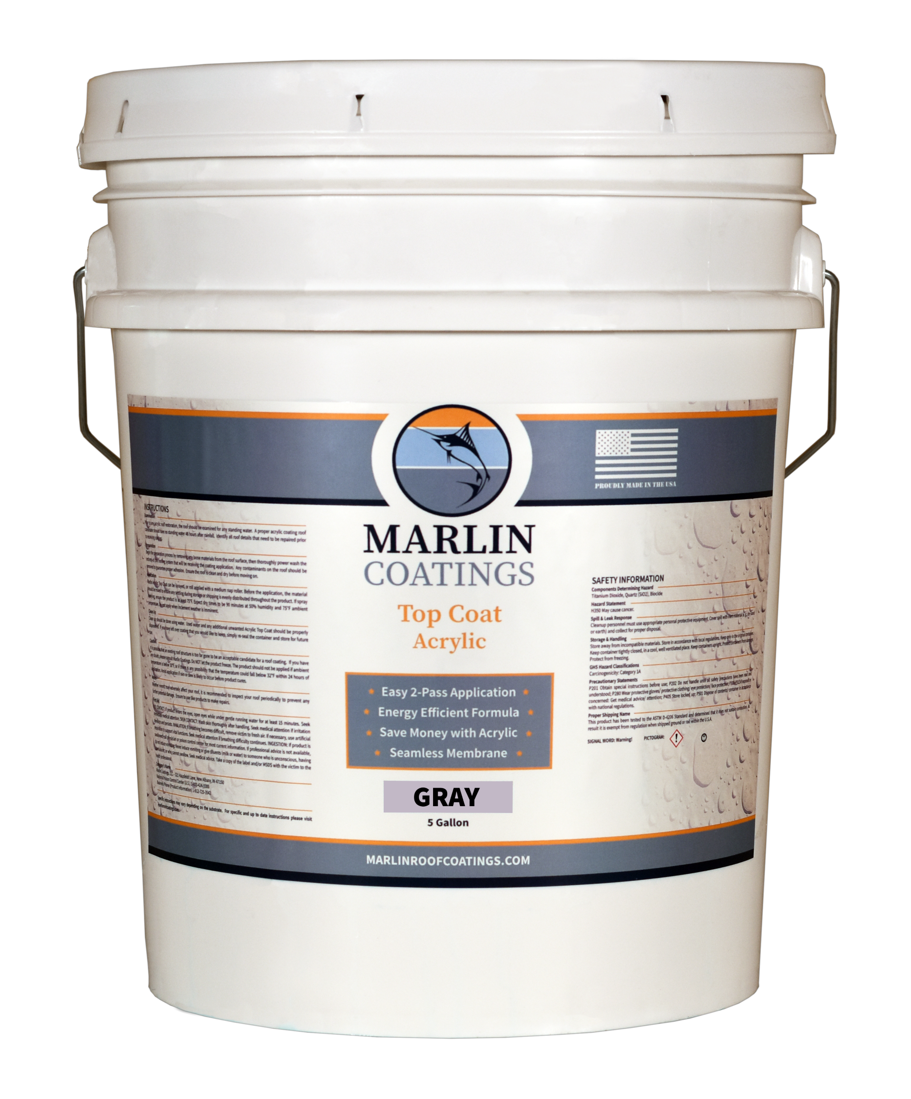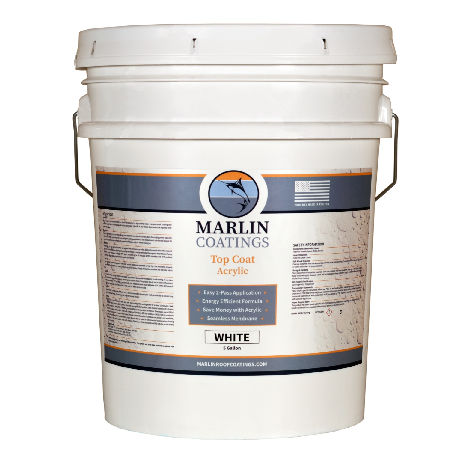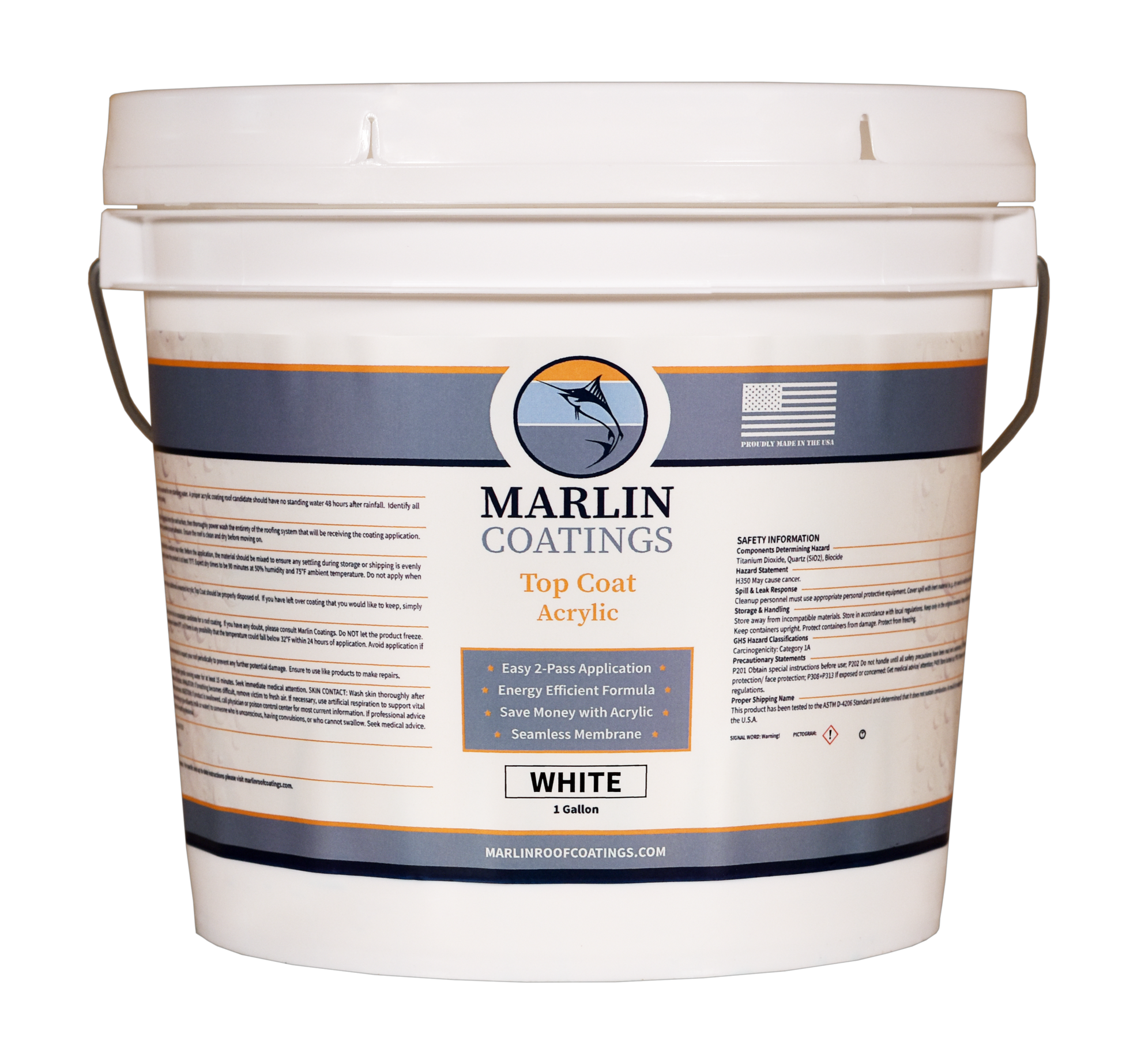 - KEY BENEFITS - Marlin Acrylic Top Coat is designed to provide a protective waterproof membrane and is formulated for maximum UV resistance and solar reflectivity, minimize discoloration, and have the ability to provide a completely waterproof membrane for roof coatings while allowing trapped moisture to escape. A waterproof membrane is an essential component of any roof coating system, providing long-lasting protection against water infiltration.