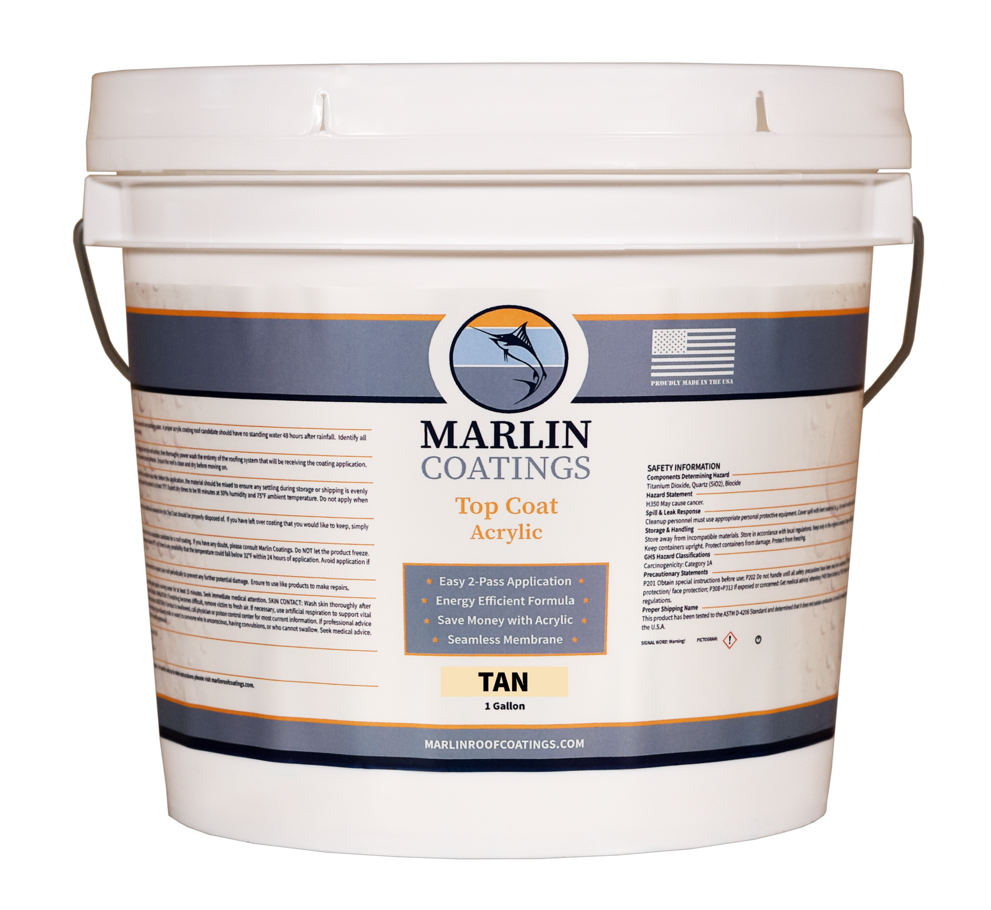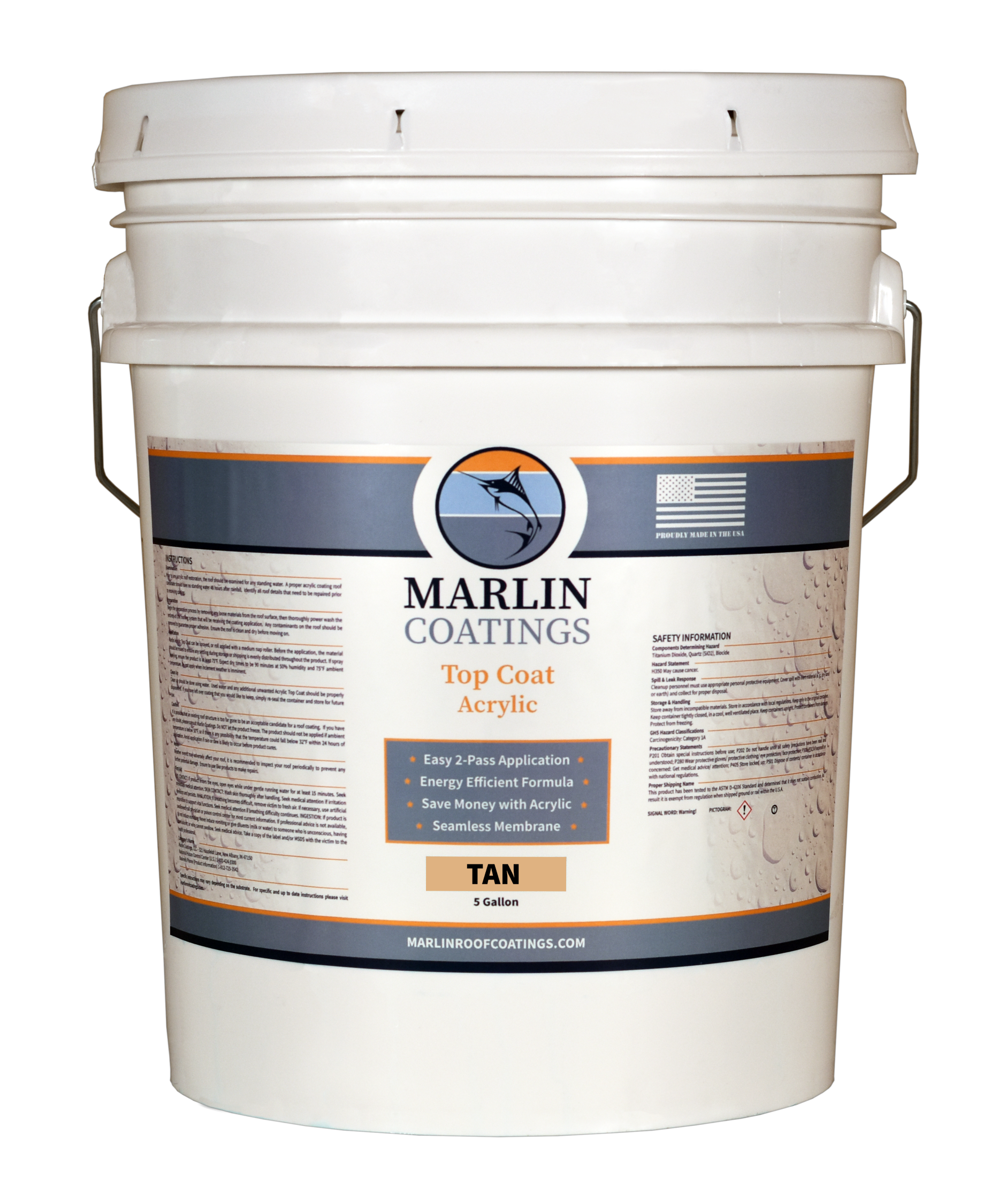 Marlin Acrylic Top Coat for roofs is a premium 100% acrylic elastomeric coating that can be brushed, sprayed, or roll applied. This is one component, plasticizer-free, a water-based product designed for use on RV, camper, trailer, commercial, and residential roofing systems. This product is proven to provide a long-lasting membrane that will maintain flexibility throughout the extreme temperatures typically found on roofs. Additionally, this product uses specialized pigments and biocides to give the end user maximum UV resistance, color stability, and minimum dirt pickup. This product is compatible with many different roofing substrates, including, PVC, Hypalon, EPDM, SPF, Metal, asphalt, and concrete.
