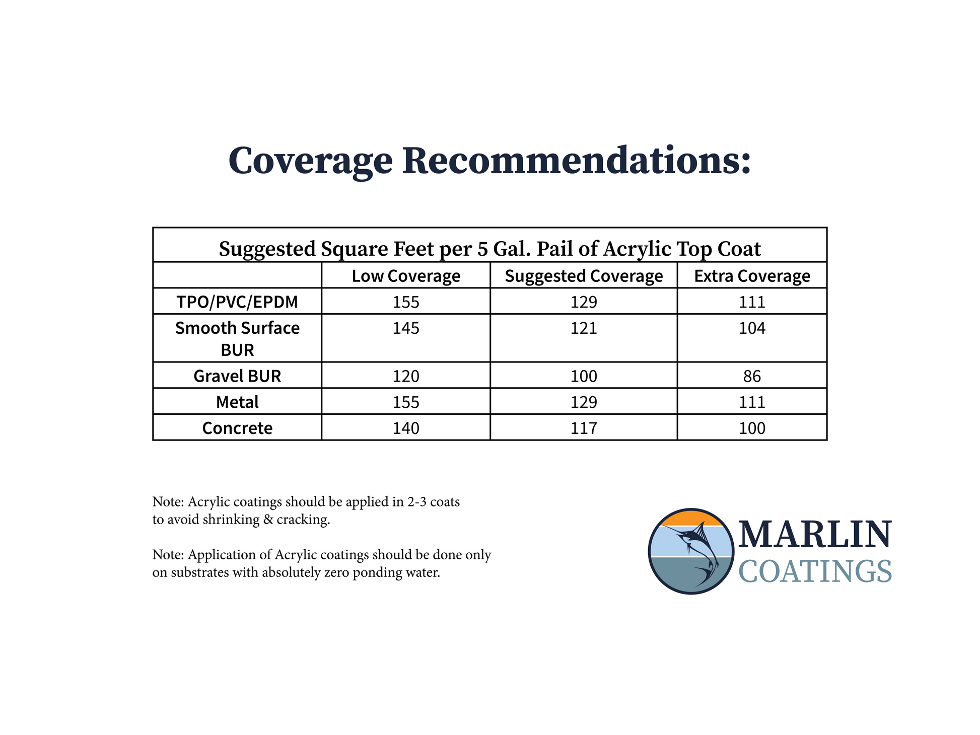 - APPLICATION & COVERAGE - This product can be brushed, rolled(1 ¼ nap), or spray applied. One gallon of Marlin Acrylic Top Coat on average covers 60sqft. To achieve proper cured thickness, we recommend that you apply a minimum of two heavy coats. Allow the first coat time to dry before applying the next coat. Do not apply the product if rain is expected or if the temperature is expected to drop below 32 degrees within 24 hours of application, ideal application is when temps are above 50 degrees F.
