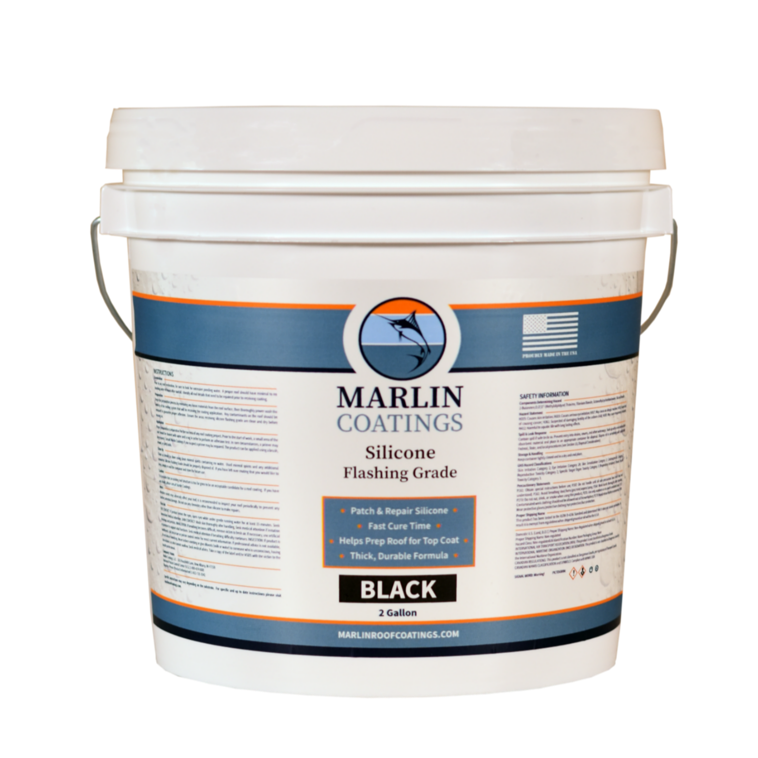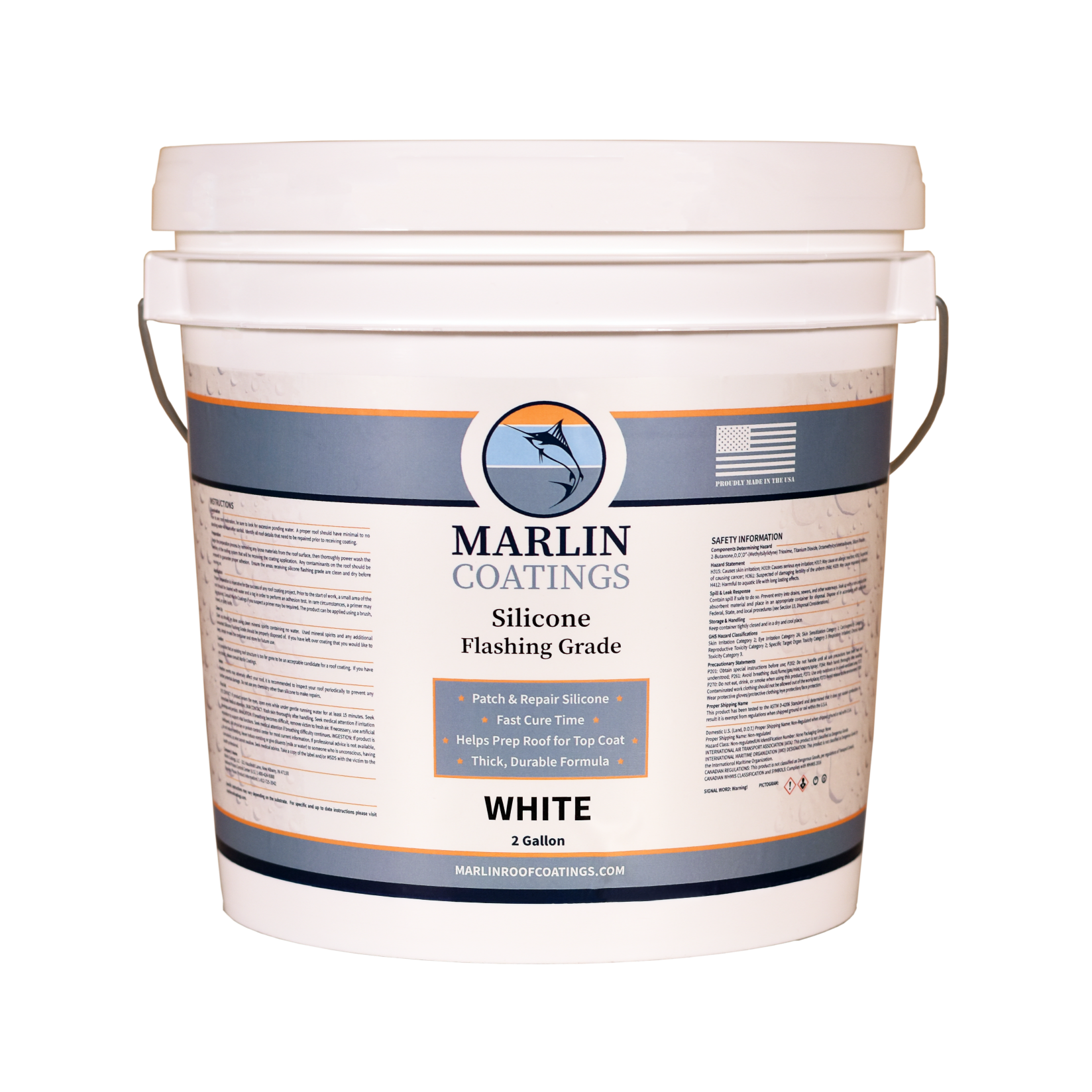 Marlin Silicone Flashing Grade is a thick, single component, high-build silicone sealant that is designed to seal gaps and penetrations that cannot be covered with a standard top coat product. It can be used as a stand alone product or in conjunction with our silicone top coat. This product has a low odor, fast cure, easy application, and excellent adhesion to many substrates. Coverage is approx. 95 lineal feet per gallon.